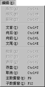 进入到添加状态或修改状态后,代表当前正处于数据编辑状态,添加、修改、删除、查询和打印等功能将暂时屏蔽,而取消、存盘按钮(菜单)将变成可用状态,如下面工具栏和编辑菜单所示: